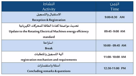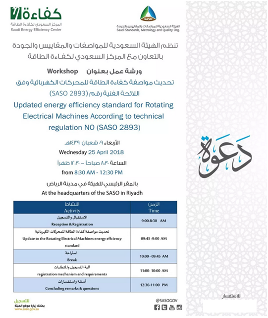 近日,沙特阿拉伯標(biāo)準(zhǔn)組織SASO發(fā)出了邀請函,通知各相關(guān)企業(yè)其將于4月25日在位于利雅得的SASO總部舉辦一場關(guān)于旋轉(zhuǎn)電機產(chǎn)品能效標(biāo)準(zhǔn)更新的研討會。當(dāng)天,SASO專員會在現(xiàn)場親自為大家對技術(shù)法規(guī)SASO 2893的新能效標(biāo)準(zhǔn)和其產(chǎn)品注冊機制及要求進(jìn)行詳細(xì)地指導(dǎo),并給予現(xiàn)場來賓自由討論的時間以便征求更多來自市場的反饋和意見。