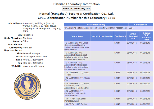 2016年6月9日,NormalTCI諾莫檢測實驗室獲得美國消費品安全委員會(CPSC)的授權認可(ID:1568)。