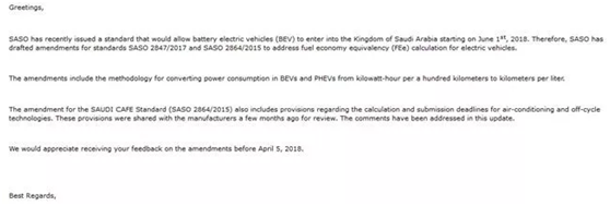 2018年3月13日SASO發(fā)出公告,對(duì)沙特機(jī)動(dòng)車燃油經(jīng)濟(jì)性標(biāo)簽法的相關(guān)標(biāo)準(zhǔn)進(jìn)行修訂,修訂標(biāo)準(zhǔn)涉及: