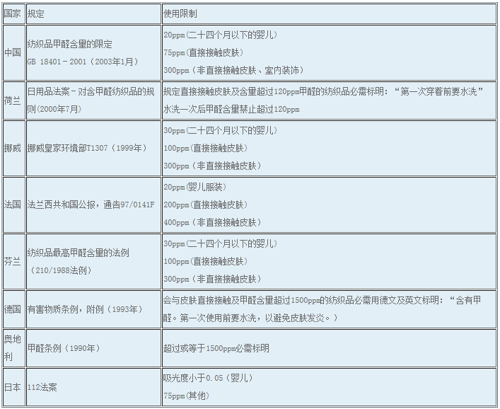含甲醛的紡織品在穿著和使用過程中,部分未交聯(lián)的或水解產(chǎn)生的游離甲醛會釋放出來,對人體健康造成損害,因此,世界主要國家紛紛出臺相關(guān)的法規(guī)或強(qiáng)制標(biāo)準(zhǔn),對產(chǎn)品的游離甲醛含量作了嚴(yán)格的限定。