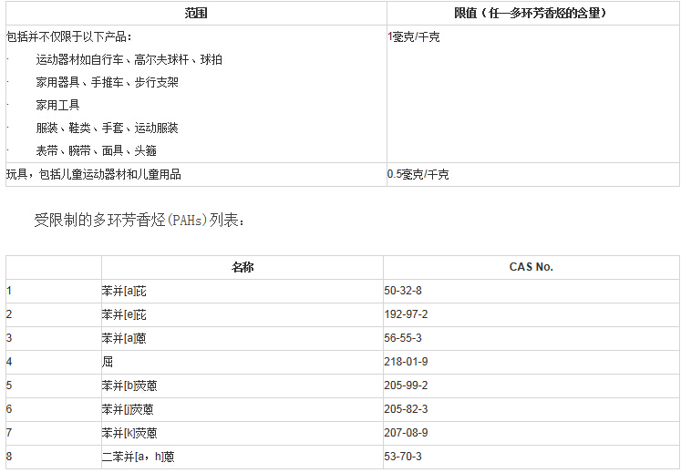 REACH法規(guī)附錄17第50條主要是限制輪胎的填充油中的多環(huán)芳香烴(PAHs),此次提案將多環(huán)芳香烴(PAHs)的限制擴(kuò)展到了能長(zhǎng)期或短期重復(fù)接觸皮膚或口腔的產(chǎn)品。具體信息如下: