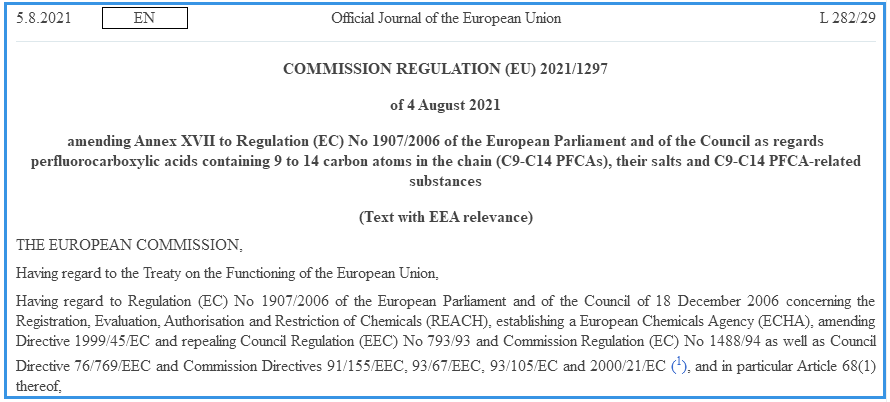 歐盟REACH附件XVII新增物質(zhì)全氟類物質(zhì)(PFCAs)限制
