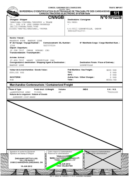 針對(duì)上述規(guī)定我們建議貴司(發(fā)貨人或出口商)嚴(yán)格地遵守以上加蓬共和國的法令并在指定時(shí)間內(nèi)提出跟蹤單的申請(qǐng)。 以上的條例及收費(fèi)率會(huì)根據(jù)加蓬有關(guān)當(dāng)局的條例隨時(shí)更改。