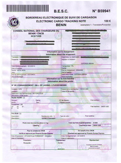 根據(jù)貝寧國(guó)法令,凡發(fā)貨至貝寧科托努 (COTONOU) 港或經(jīng)由此港轉(zhuǎn)往其他目的地的貨物都必須申請(qǐng)電子貨物跟蹤單BESC,BESC全稱為:BORDEREAU DE SUIVI DE CARGAISON。